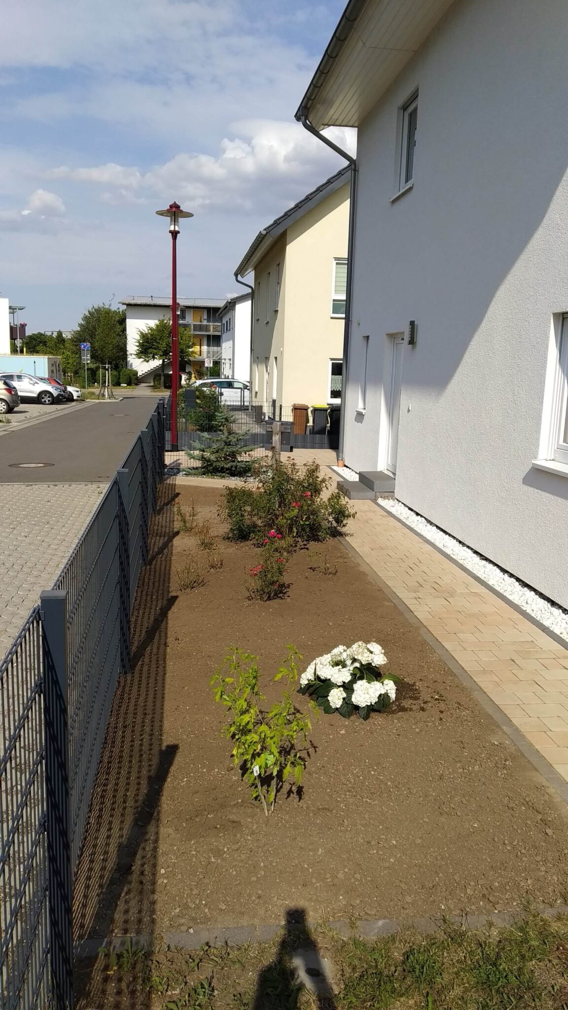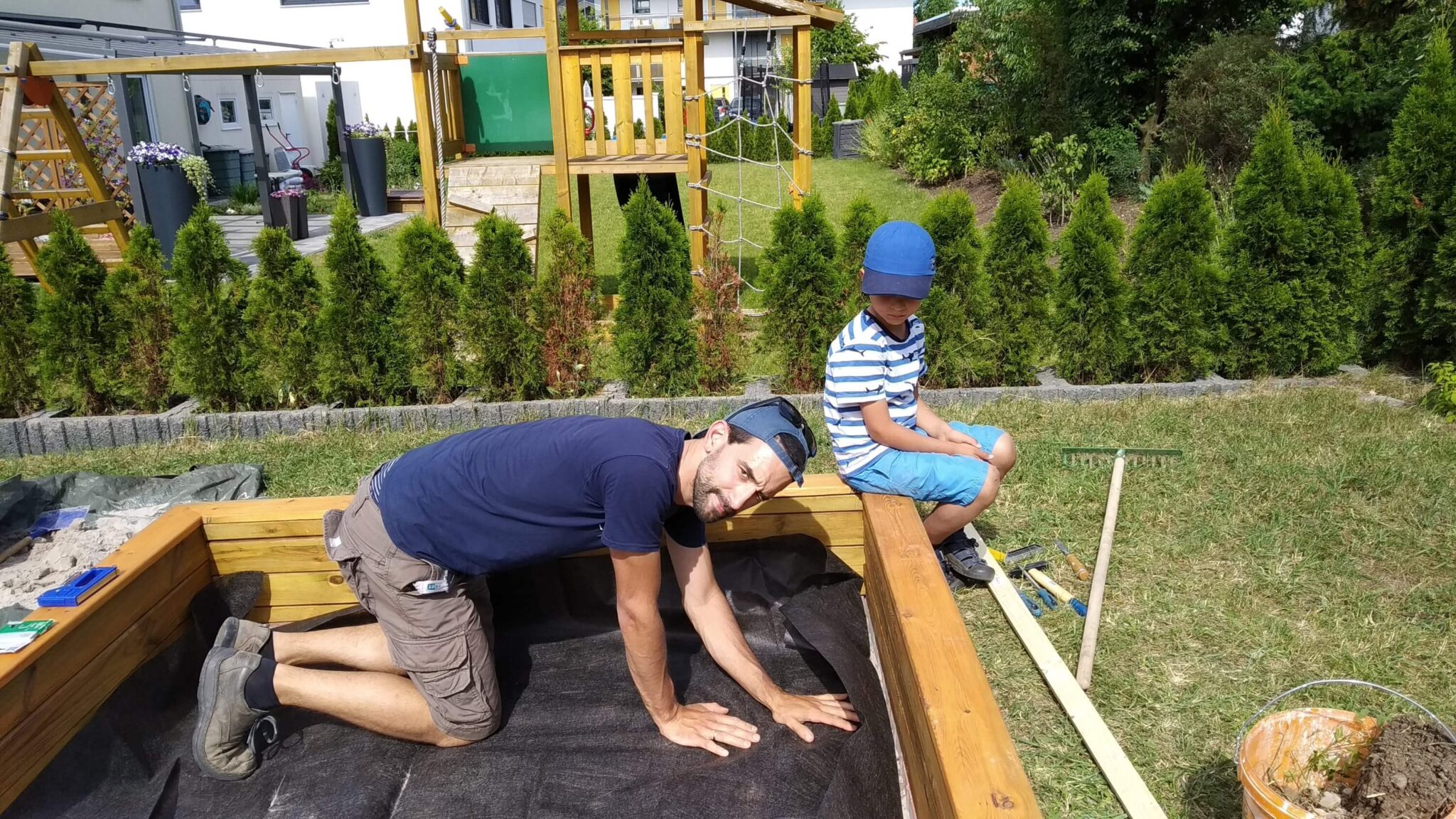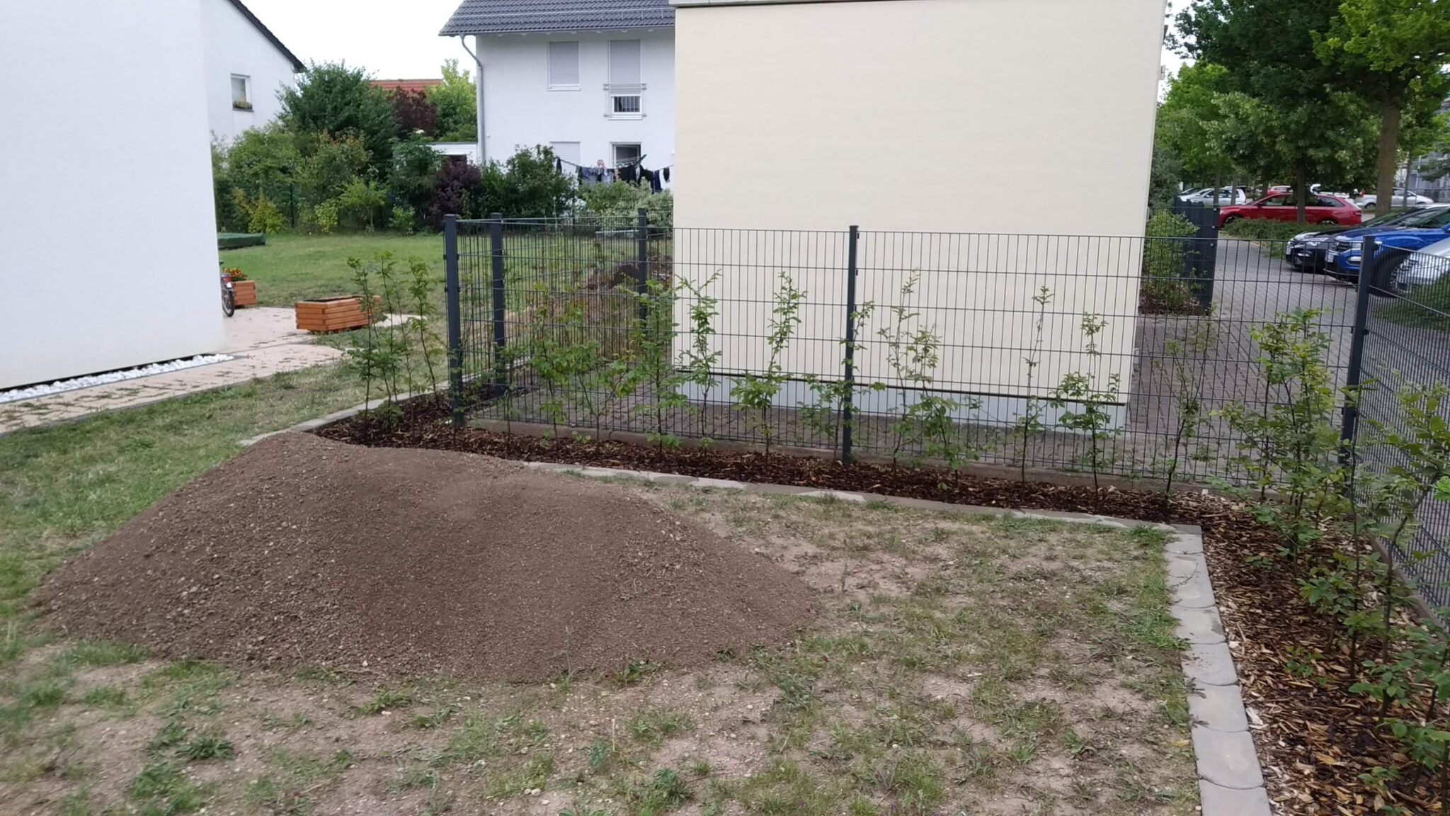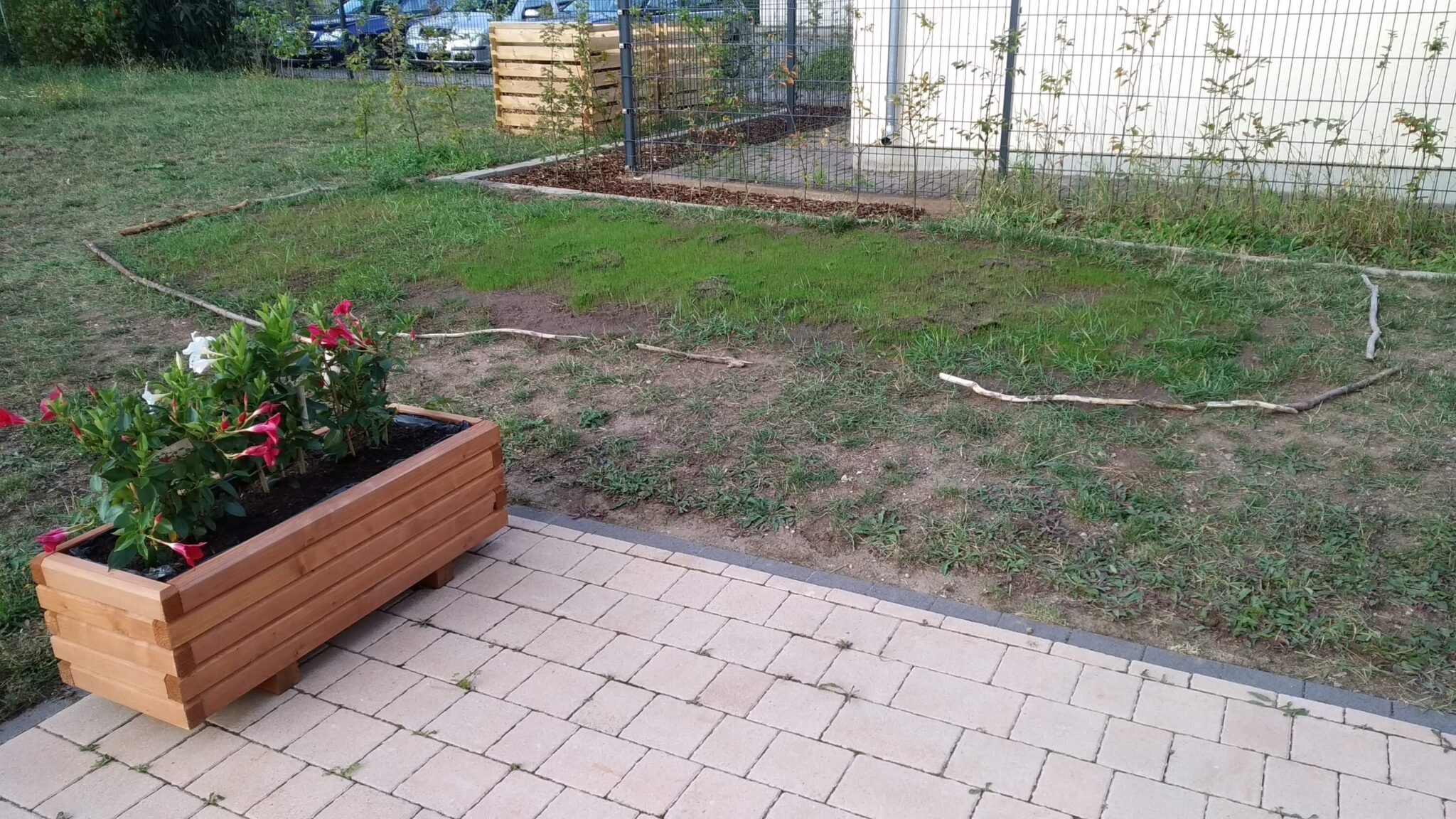 Die kleine Hitzepause habe ich genutzt, um etwas Rasen zu sähen. Nach Beseitigung des Erdhaufens und Abtransport von weiteren knapp 300kg Steinen grünt jetzt schon der frische Rasen. Mal sehen ob er die kommende Hitze am Wochenende übersteht. Werde ihn wohl mit einer Plane abschatten, damit die Erde feucht bleibt. Auch der letzte Pflanzkasten wurde nun endlich bepflanzt.