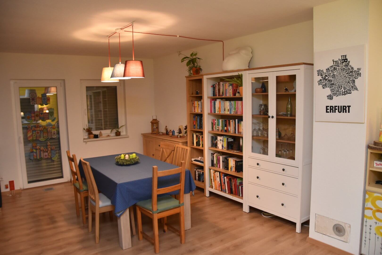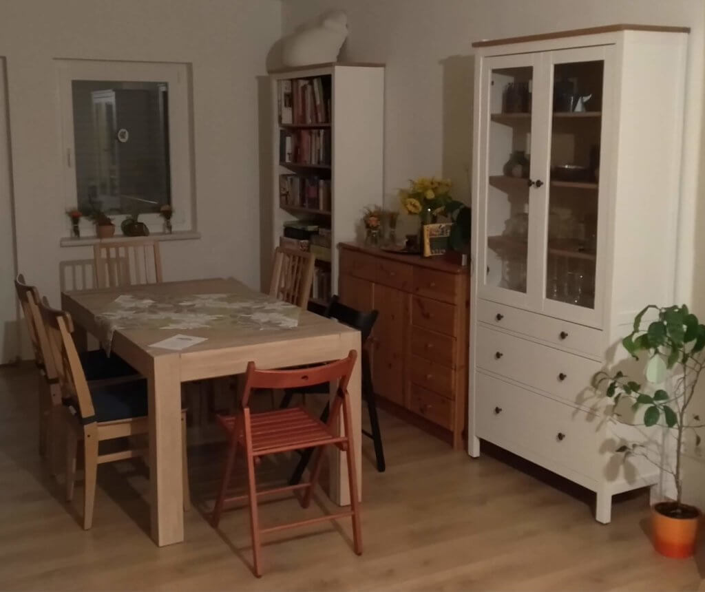 Heute hat es im Wohnzimmer geruckt. Möbel wurden aufgebaut und gerutscht und die lange vorbereitete Lampe über dem Esstisch wurde angebracht. In Ermangelung eines Stromauslasses musste Strom aus einer Steckdose angezapft und ein neuer Doppelschalter mittels Shelly smart gemacht werden. Jetzt ist alles schick.