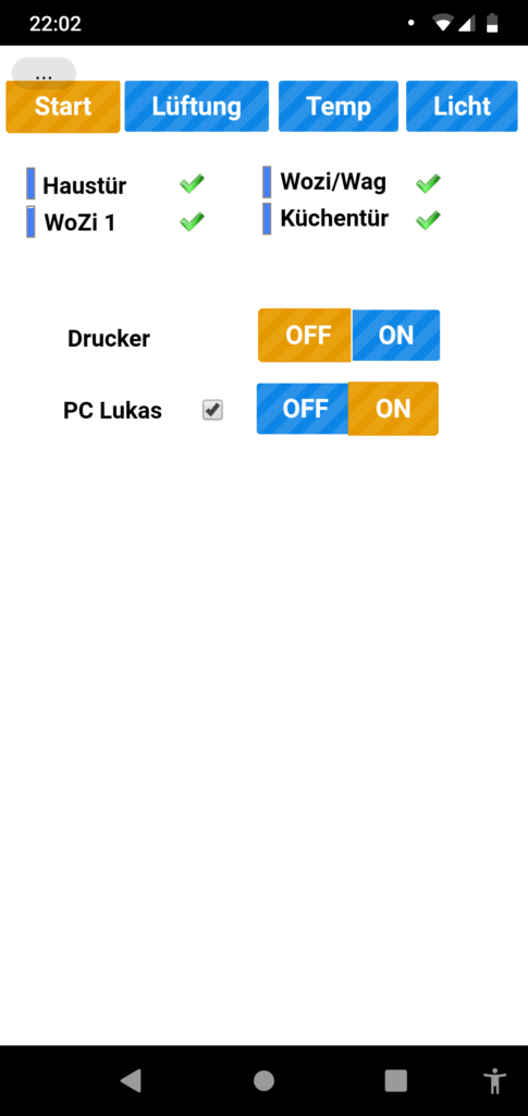 Temperatur- und Luftfeuchtigkeitssensoren geben bereits Einblick ins (erfreuliche) Wohnklima. Tür-Sensoren zeigen an, ob Türen geschlossen sind. Ein Wassermelder ist für den Ernstfall im Heizraum installiert, und warnt, sollte was schief gehen. Drahtlose Taster verrichten ihren Dienst, warten aber noch auf ihre endgültige Funktion. Schaltbare Steckdosen lassen sich schalten. Leuchtmittel lassen sich dimmen und schalten. Auf Bewegungs-/Lichtsensoren warte ich noch … genauso wie auf die Shellys, mit denen konventionelle Lichtschalter „smart“ gemacht werden sollen.